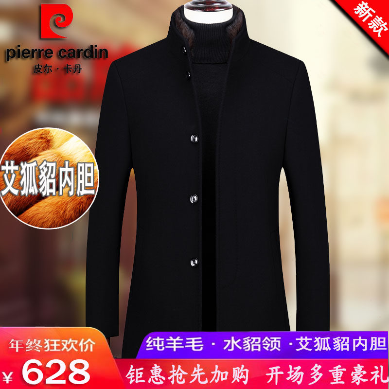 皮尔卡丹男装冬季纯羊毛呢子大衣中年水貂毛领加厚内胆中长款外套