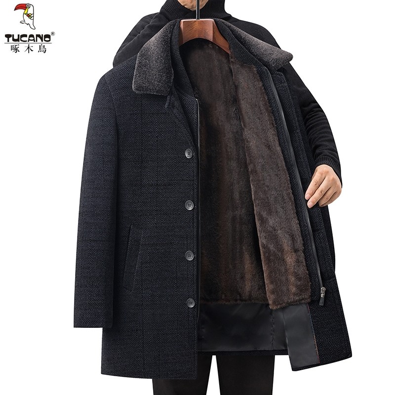 啄木鸟冬外套中老年加绒加厚可脱卸内胆两件套毛呢大衣爸爸呢大衣