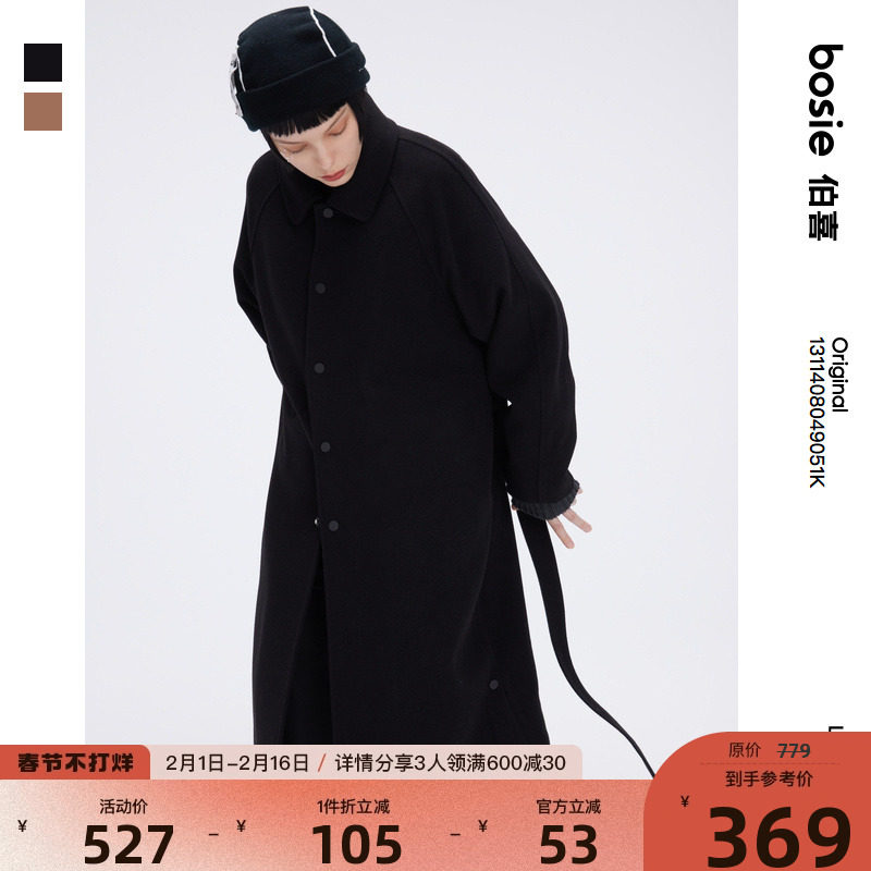 【商场同款】bosie2023年冬新款毛呢长款大衣男情侣撞色简约百搭