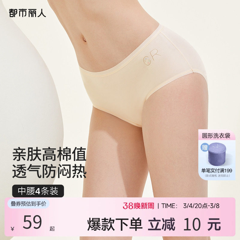 都市丽人棉质抗菌纯棉裆三角短裤透气柔软纯色顺滑女士内裤4条装