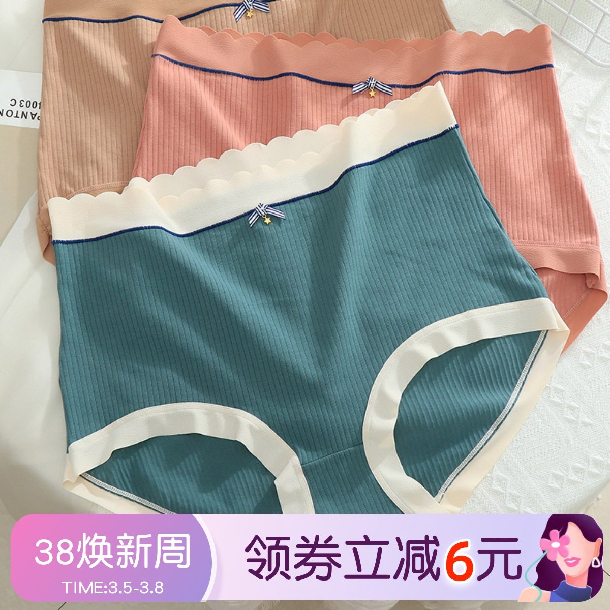 蝶安芬女士内裤女100%纯全棉质宽松舒适透气高腰三角收腹简约裤头