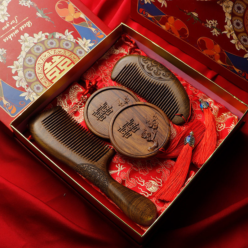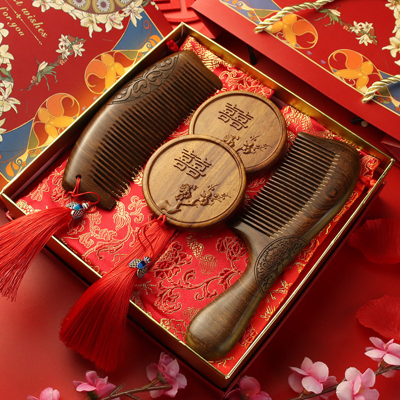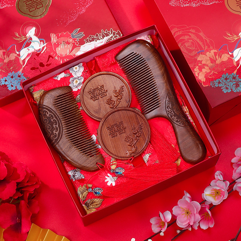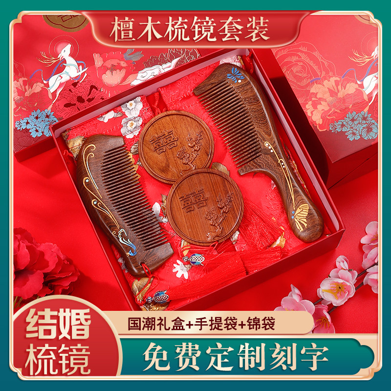 结婚陪嫁梳子对梳镜梳对镜送新人檀木婚庆木梳礼品一对订婚礼物
