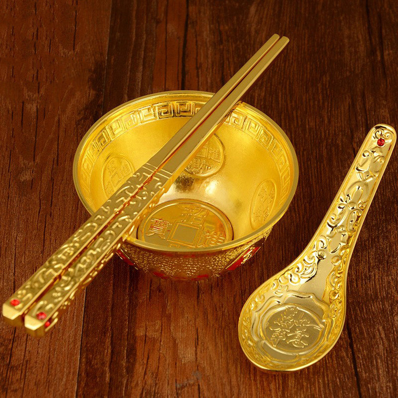 合金碗筷三件套金筷子饭碗装饰品金饭碗摆件家用节日婚庆礼品礼物