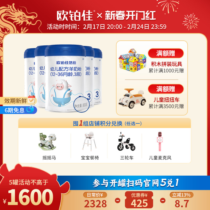 欧铂佳悠佳婴幼儿配方羊奶粉3段(12-36月龄)800g5罐装 新国标