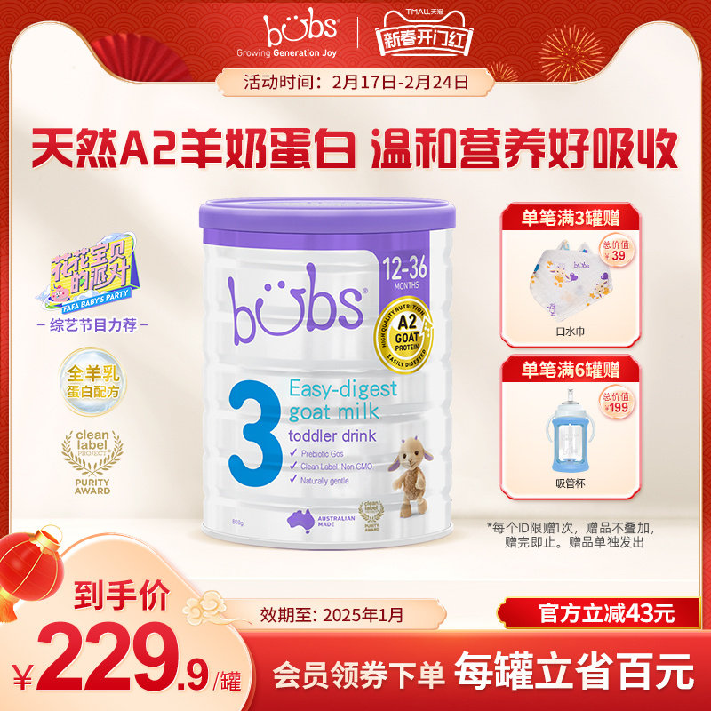 【入会减】澳洲进口婴幼儿bubs羊奶粉3段官方A2蛋白羊奶三段800g