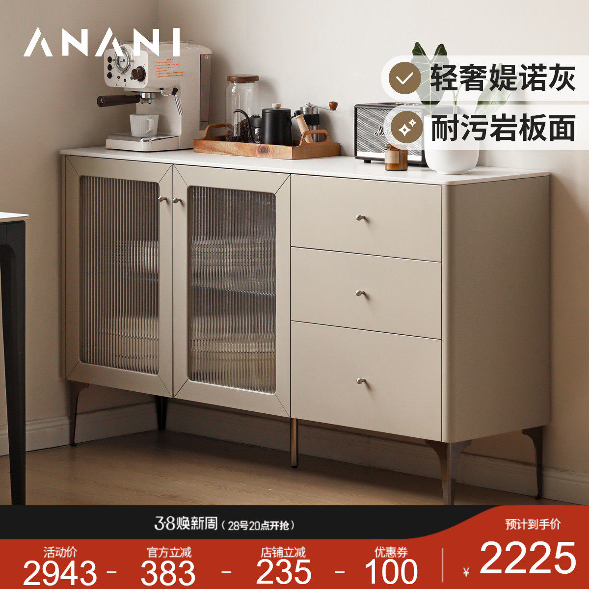 阿纳尼实木餐边柜餐厅简约岩板靠墙储物柜子家用橱柜轻奢茶水柜