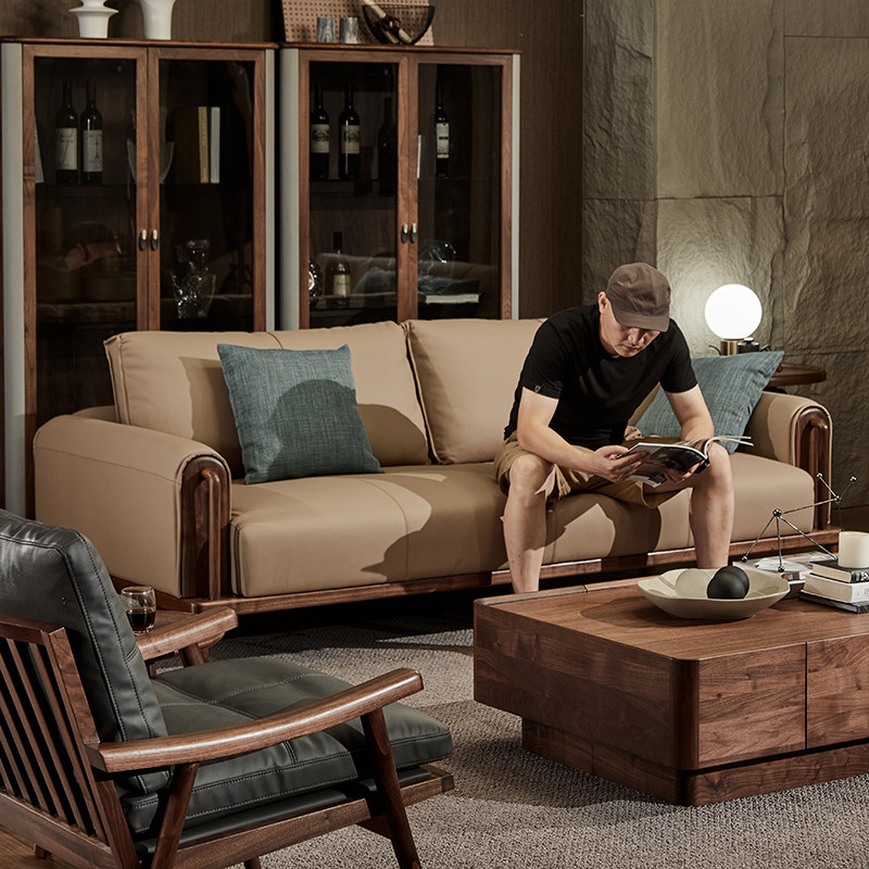 北美黑胡桃木沙发意式简约客厅实木真皮沙发小户型三人四人位沙发