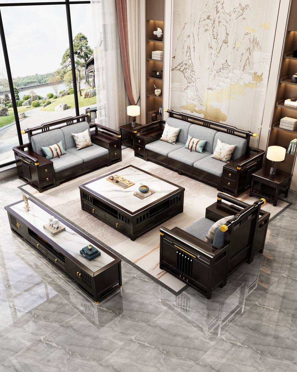 新中式乌金木实木沙发冬夏两用现代轻奢贵妃转角沙发别墅客厅家具