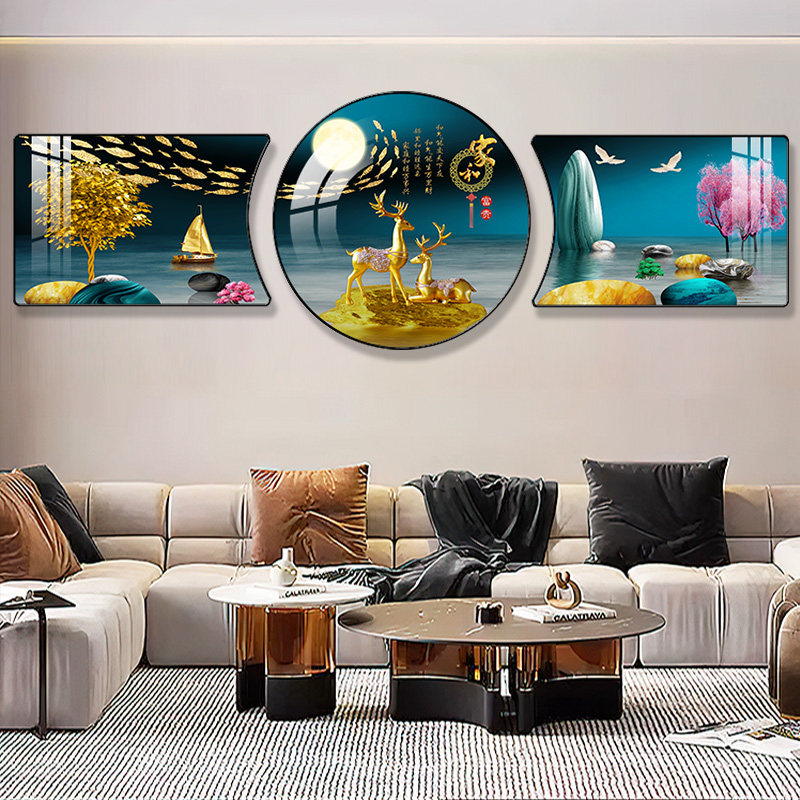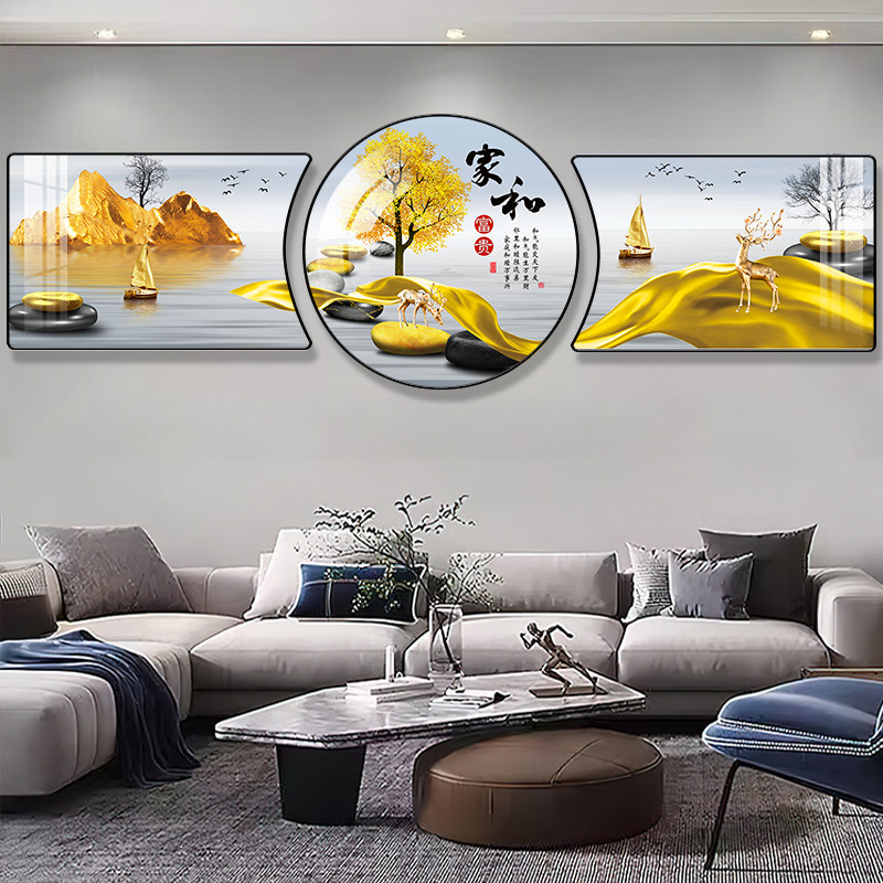 客厅装饰画沙发背景墙挂画现代中式晶瓷三联壁画餐厅轻奢画背景画