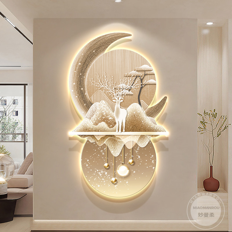 过道走廊高级福鹿挂画客厅简约发光壁灯画立体砂岩大气玄关装饰画