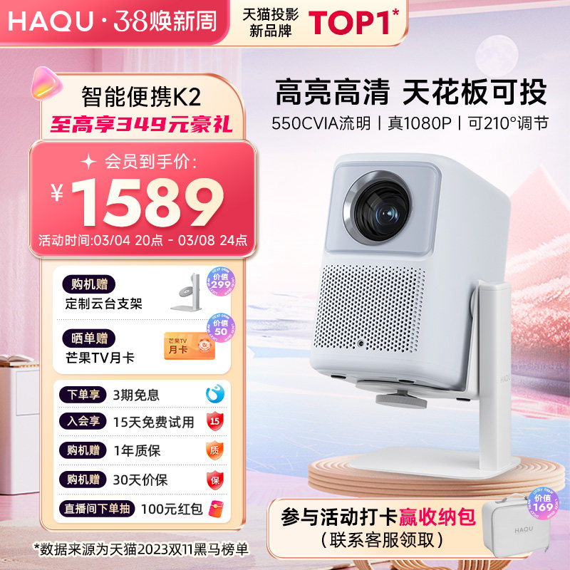 【新品首发】哈趣K2云台投影仪 家用超高清新款卧室投墙便携游戏投影机小型宿舍家庭影院1080P天花板可投
