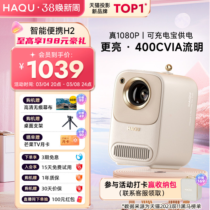 【移动便携】哈趣H2投影仪家用超高清卧室家庭影院可连手机投墙新款小型宿舍学生游戏户外露营移动便携投影机