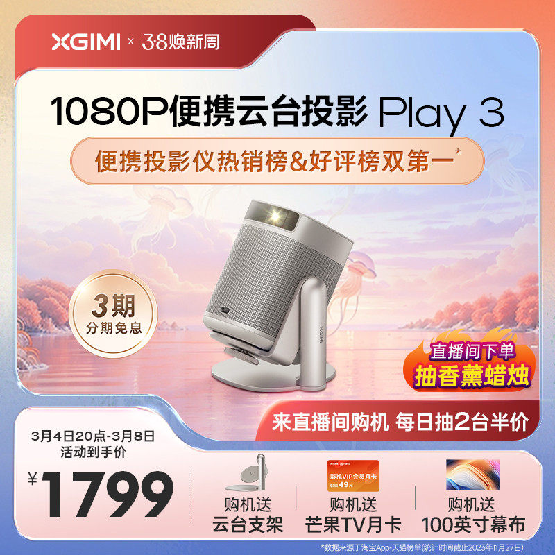 【便携爆款投影】极米Play 3云台投影仪家用1080P全高清智能小型卧室投影机户外露营大屏家庭影院