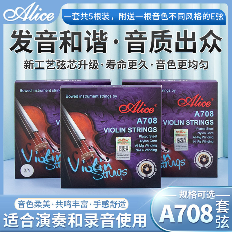 Alice爱丽丝小提琴琴弦初学A708演奏尼龙弦5根小提琴弦套装送E弦