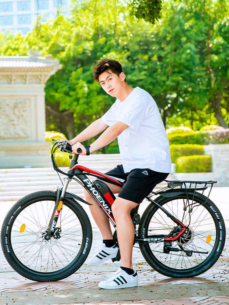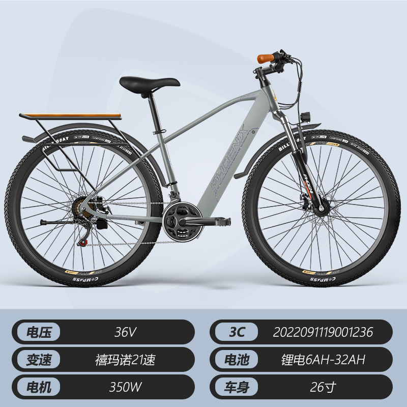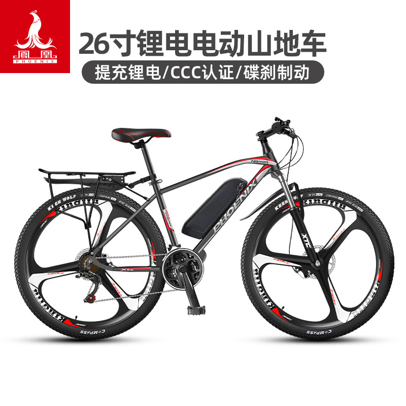 凤凰26寸锂电电动自行车新国标碟刹锂电瓶电动21速减震山地自行车