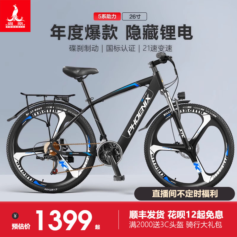 凤凰电动自行车21速26寸碟刹山地车内置式锂电助力电动车689