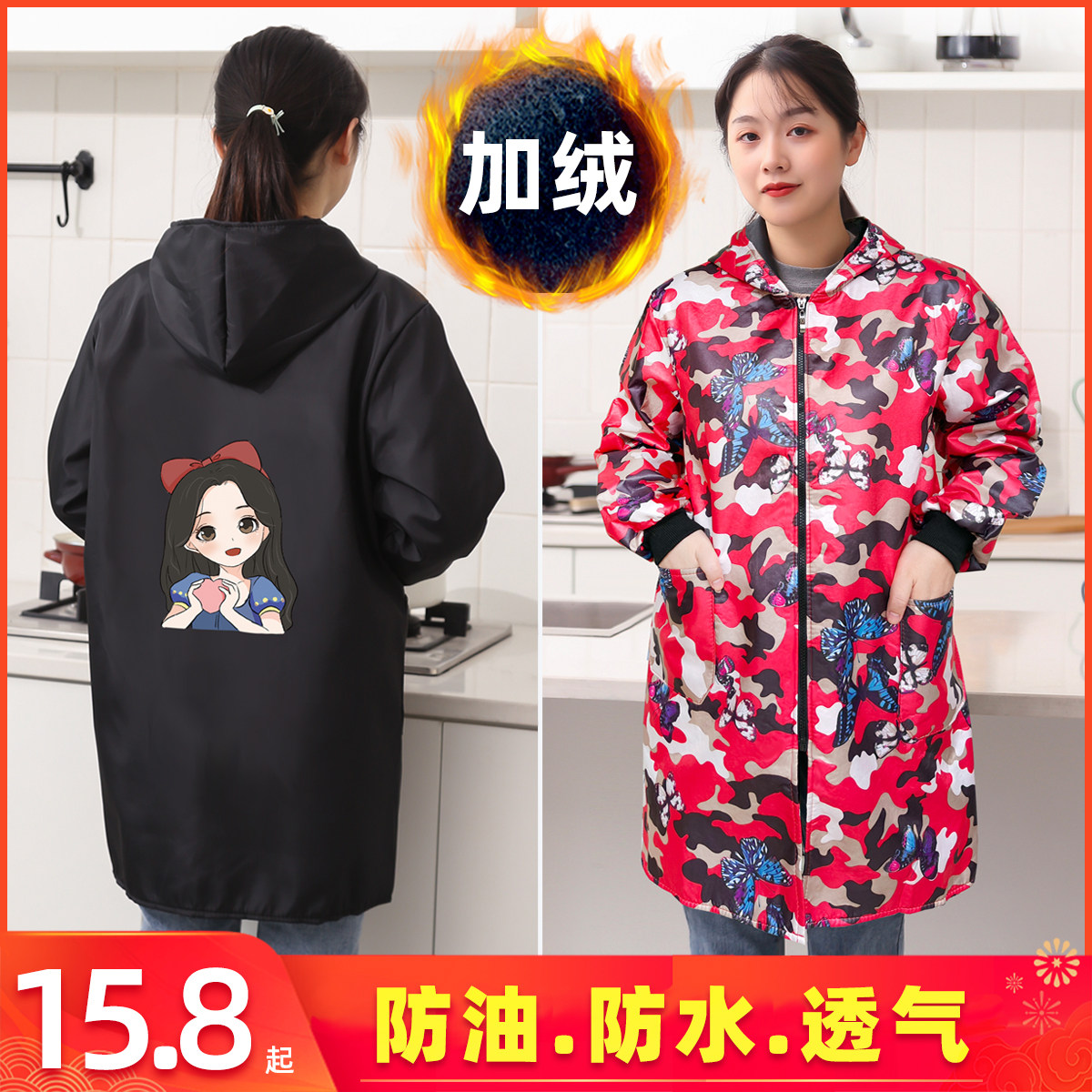 新款罩衣冬季加绒加厚保暖防水防油围裙厨房家用长袖秋冬工作服女
