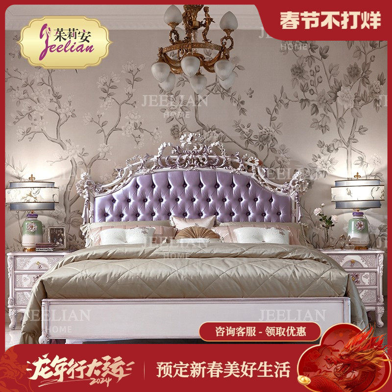 茱莉安法式浪漫紫色布艺双人床1.8米复古实木雕花卧室大床