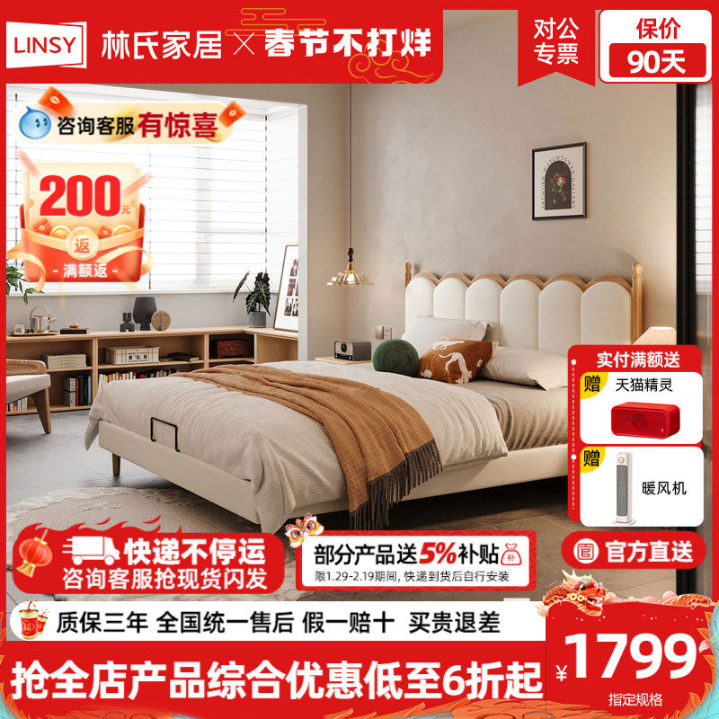 林氏家居原木奶油风猫爪皮布艺床琴键软包双人床主卧室林氏木业