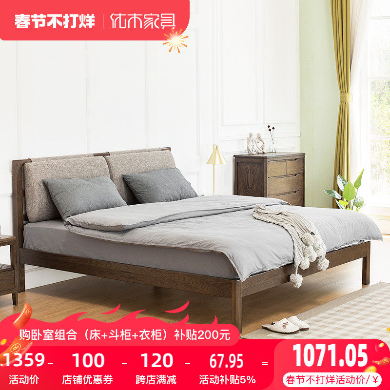 优木家具纯实木床1.8米双人床橡木床1.5米软包布艺靠背床北欧简约
