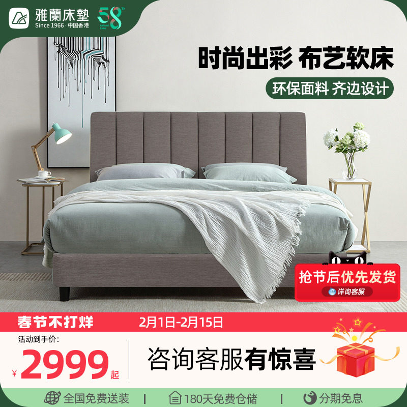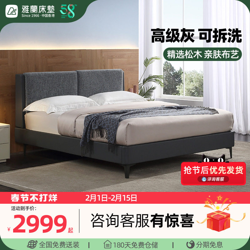 雅兰现代简约布艺床可拆洗软包大床1.8米轻奢主卧室双人床 怡眠