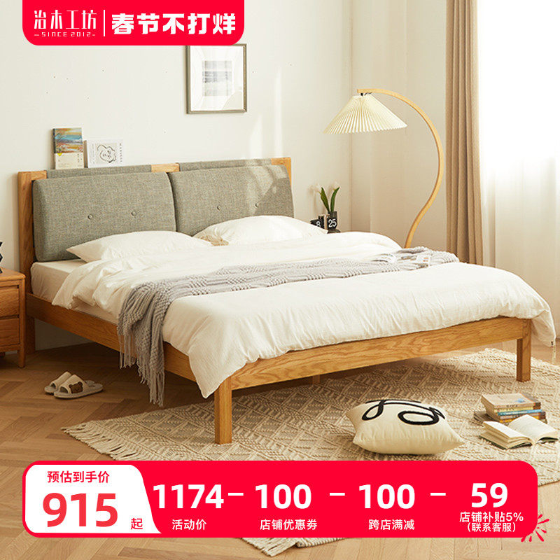 治木工坊全实木床1.8米双人床橡木床1.5米简约现代软包布艺床