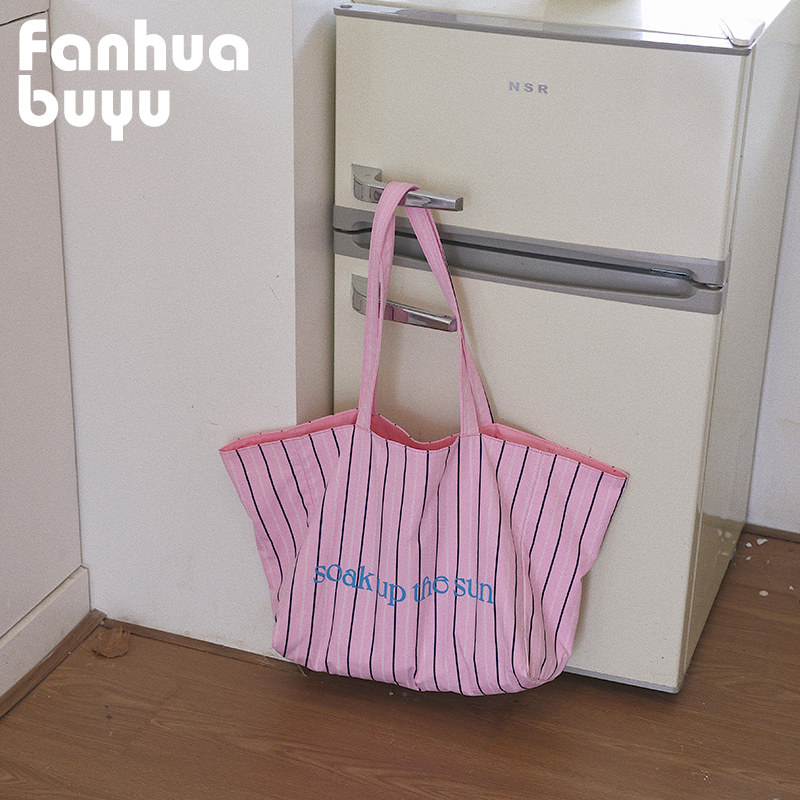 梵花不语时尚条纹帆布包女大容量托特包小众通勤单肩包休闲手提包
