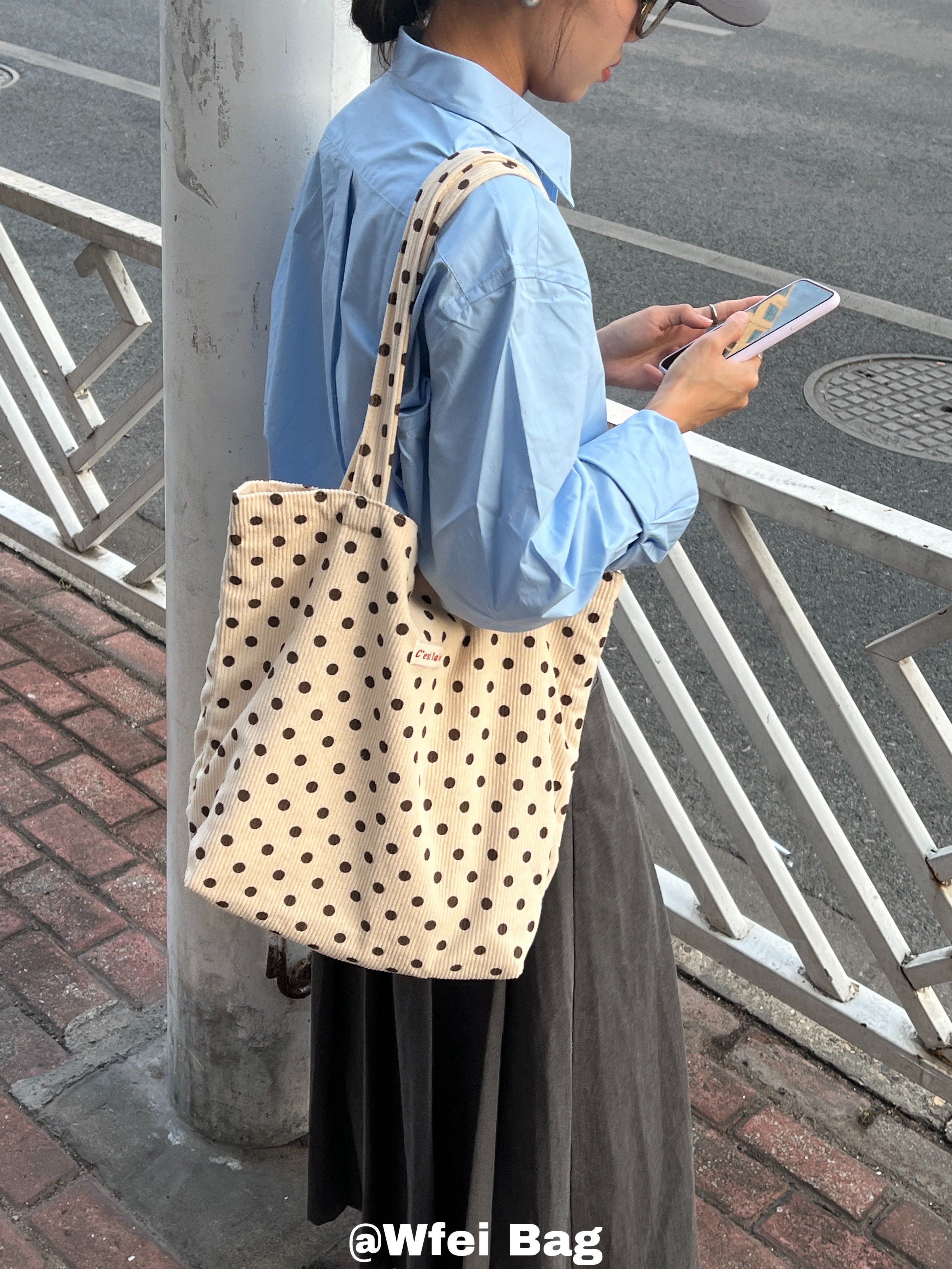 Wfei复古灯芯绒波点单肩包帆布包韩版百搭休闲大容量通勤托特包女