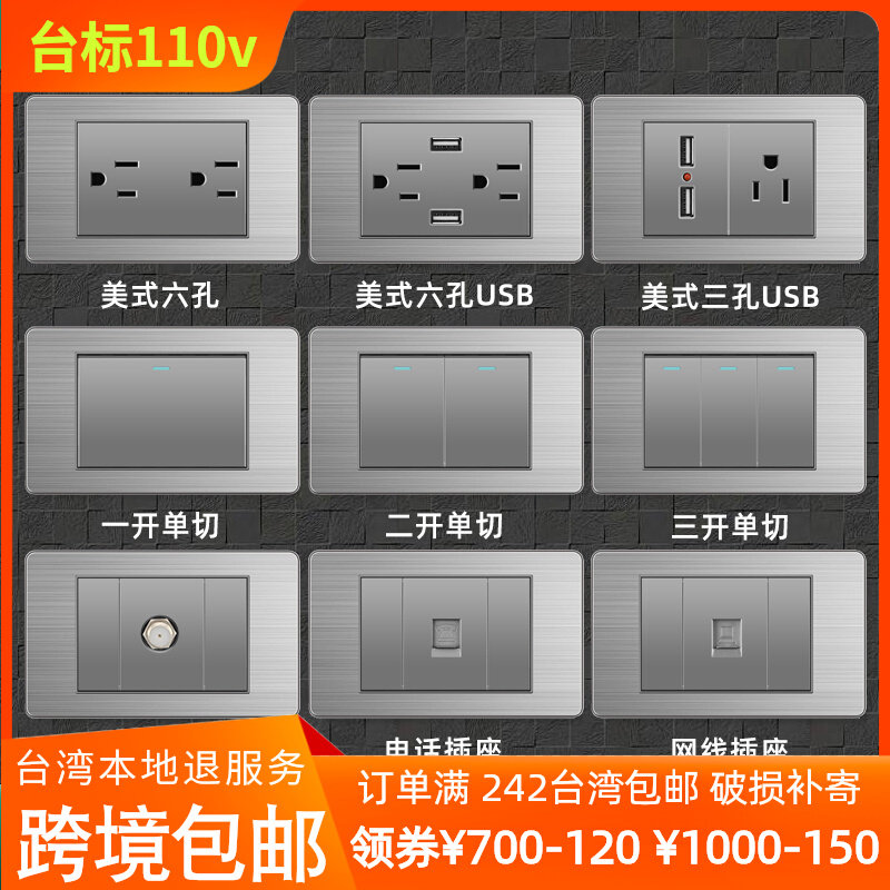 110v美标15a台湾插座USB带type-c墙壁电灯开关面板不锈钢灰美规插
