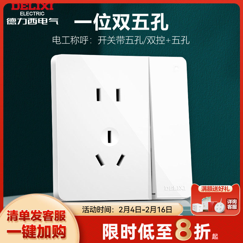 德力西开关插座一位一开五孔86型家用电源墙壁面板821系列 白