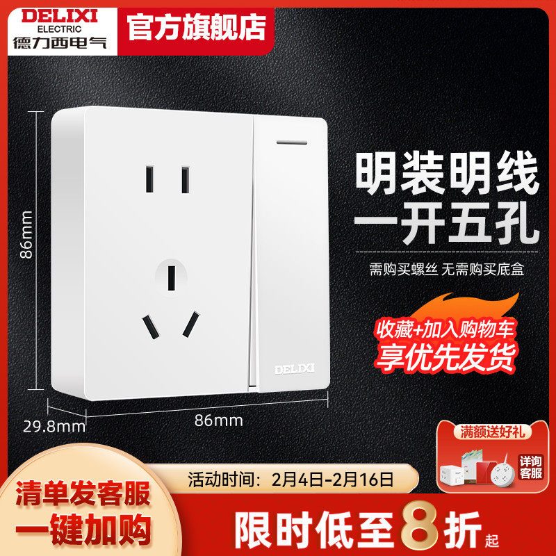 德力西开关插座明装一开五孔单控插座明线插座面板多孔墙壁插座