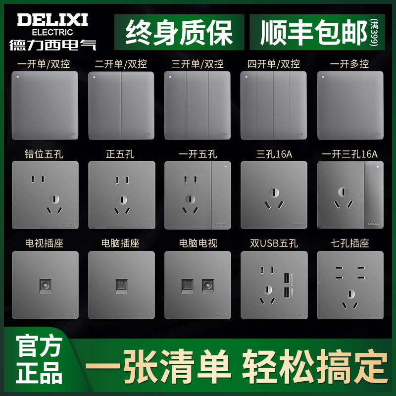 德力西开关插座面板墙壁家用86型暗装灰色5孔带usb一开双控五孔