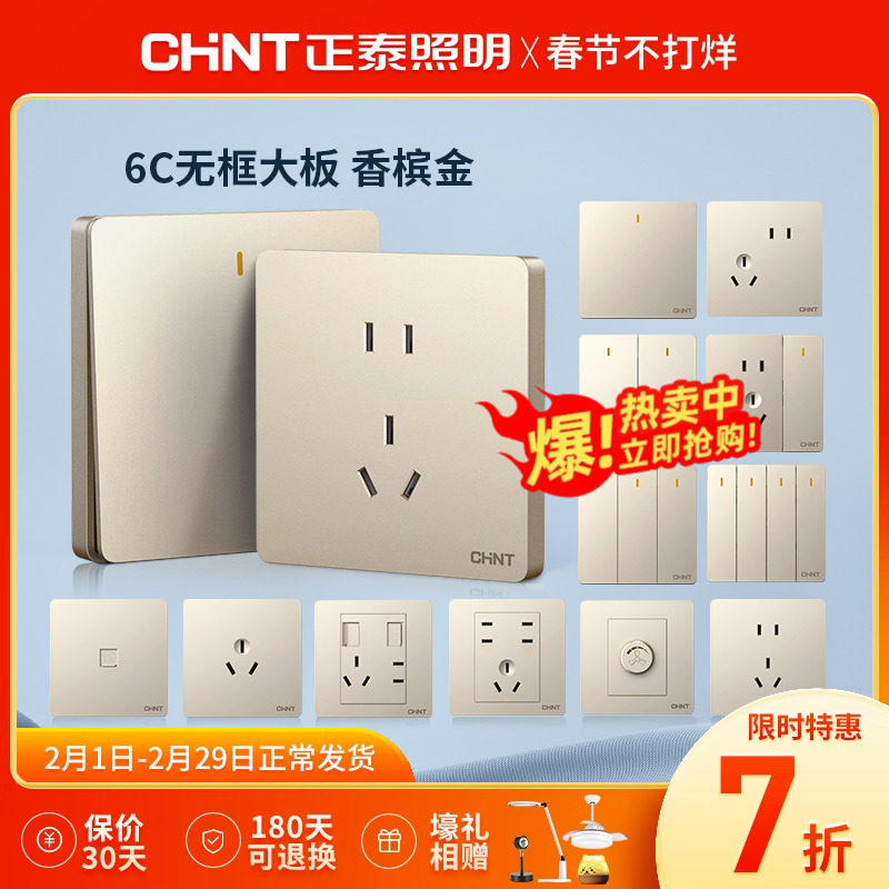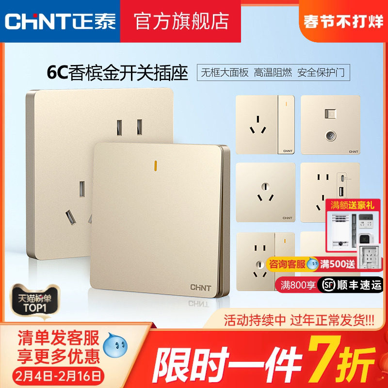 正泰开关插座家用香槟金86型暗装带5五孔电源插座面板多孔 开关6C