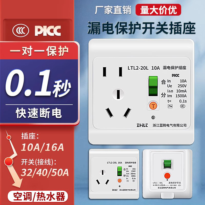 空调漏电保护插座16A电热水器漏保插座10A家用漏电保护开关32/40A