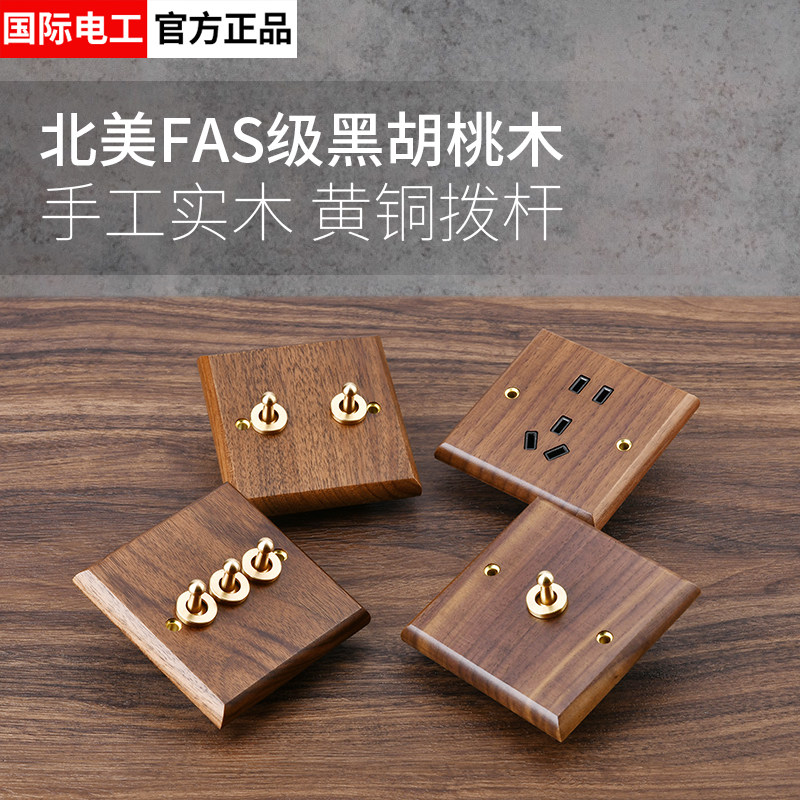 美式黑胡桃面板黄铜拨杆仿古实木复古开关插座86型民宿开关