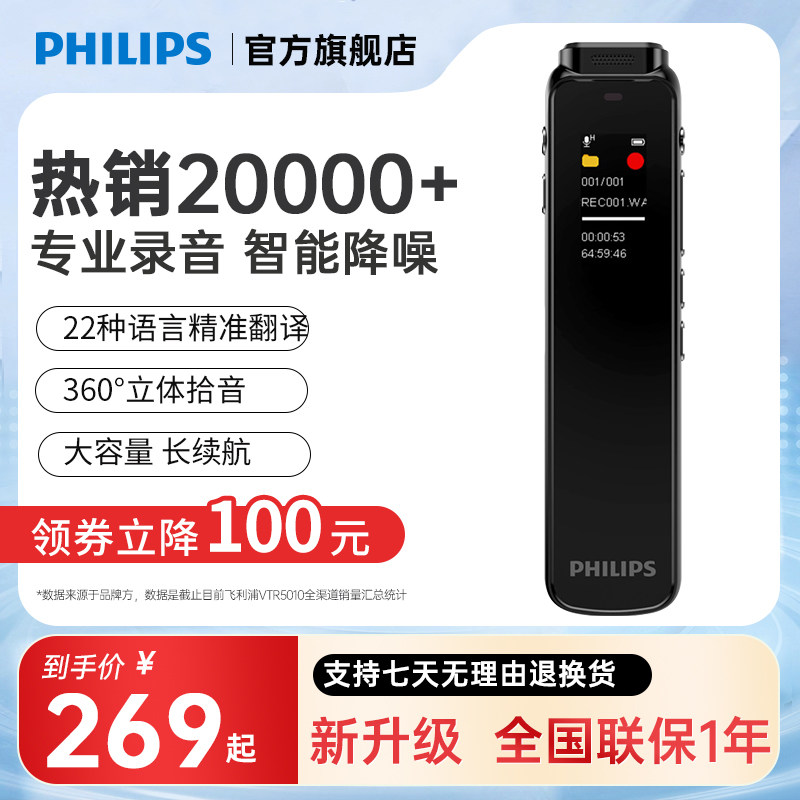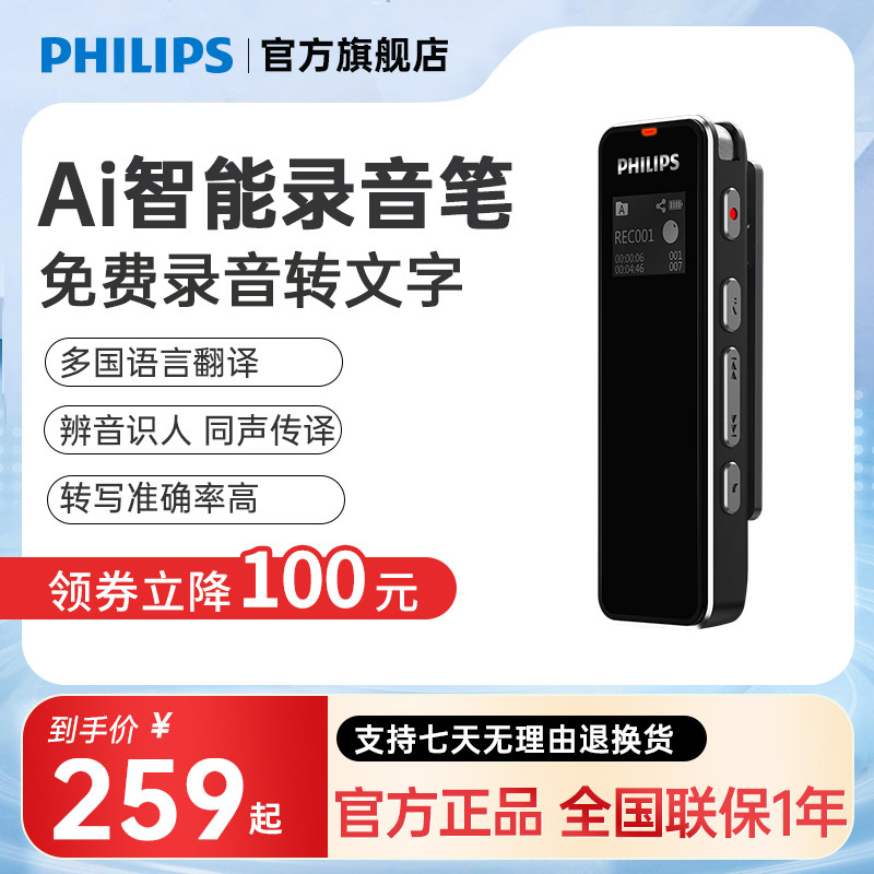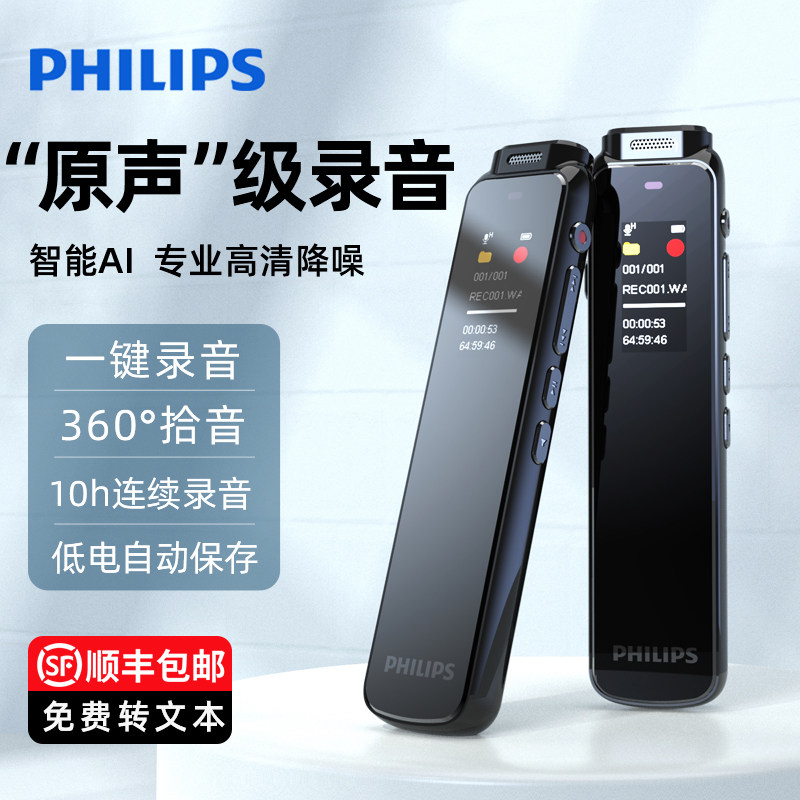 飞利浦AI录音笔转文字VTR5102专业高清降噪开会议超长待机大容量