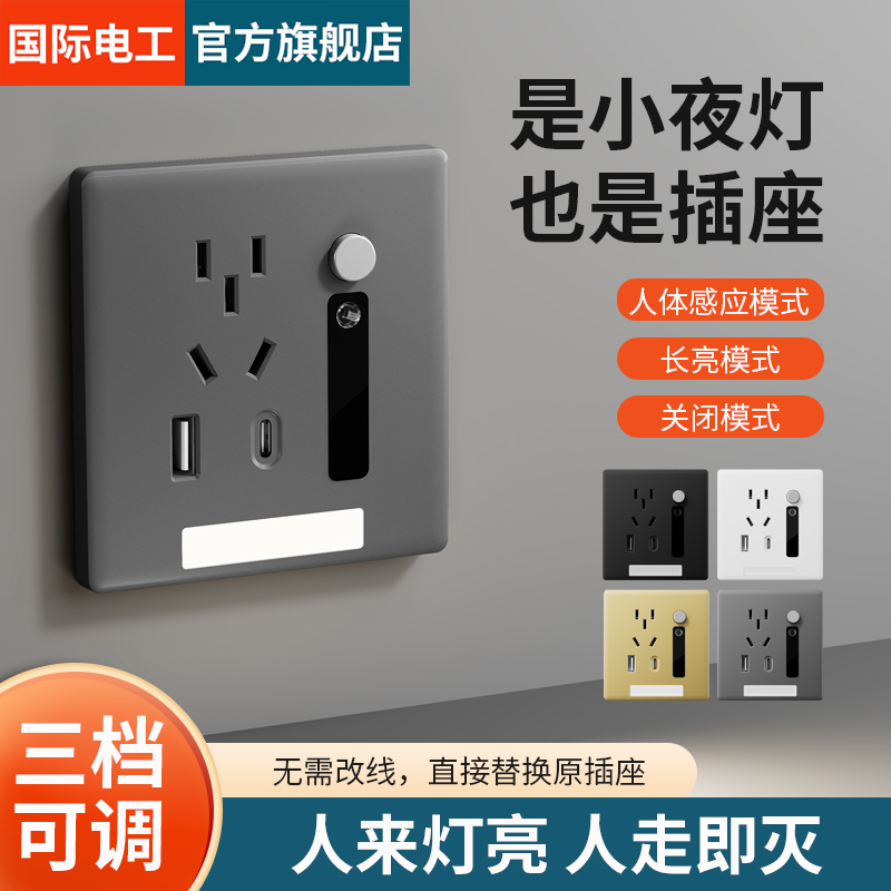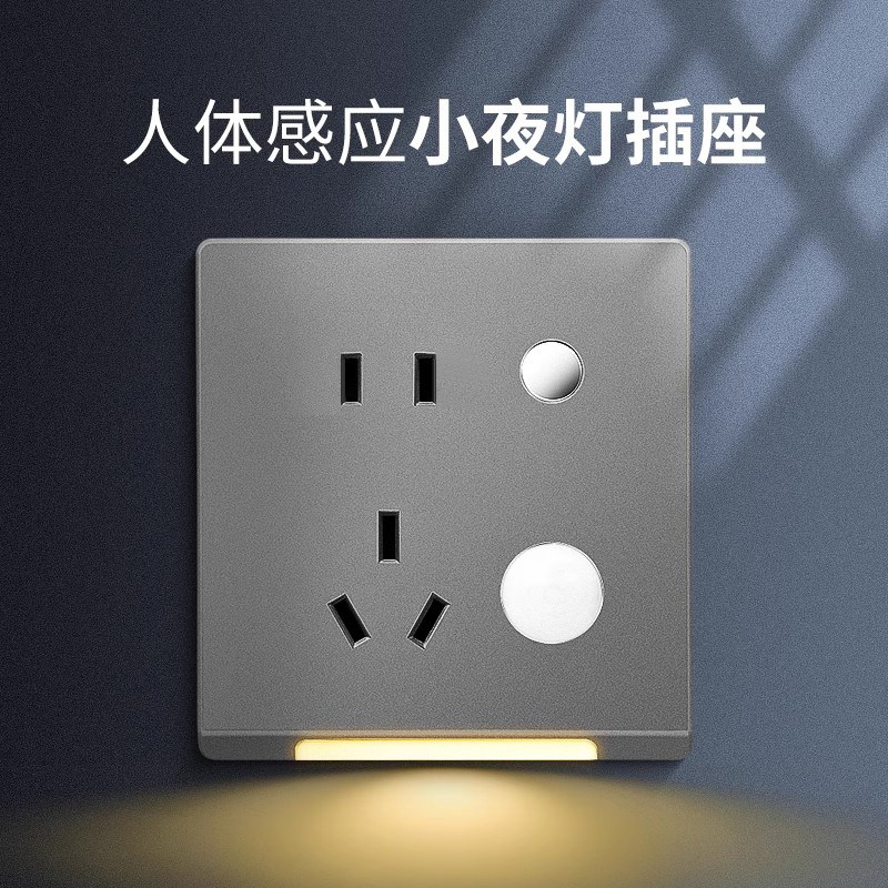 86型人体红外感应小夜灯楼道五孔开关插座面板懒人自动开关
