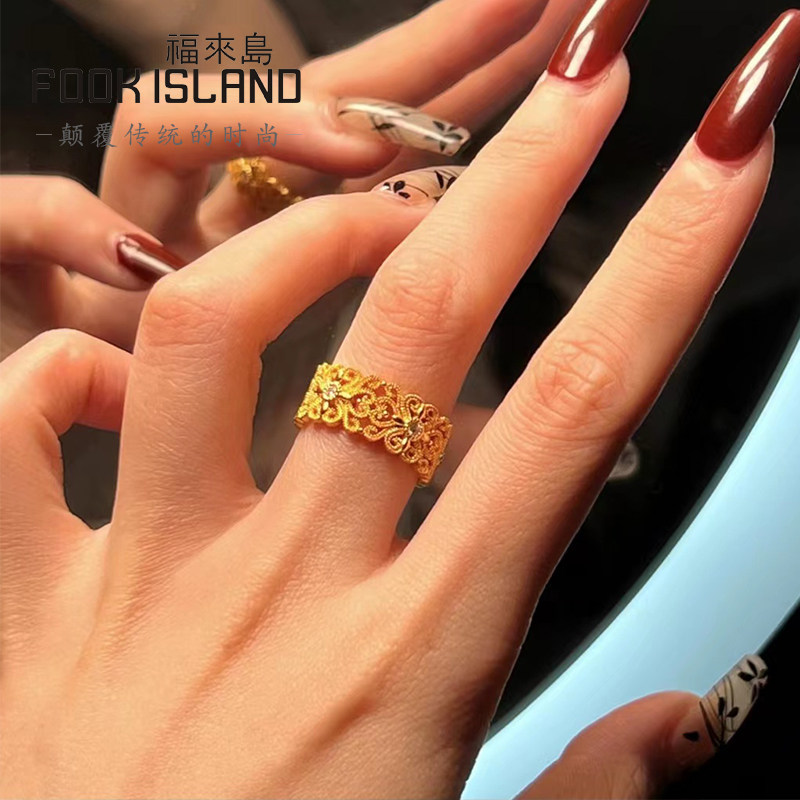 福来岛黄金戒指复古款蕾丝钻石戒指古法金999足金时尚新款女