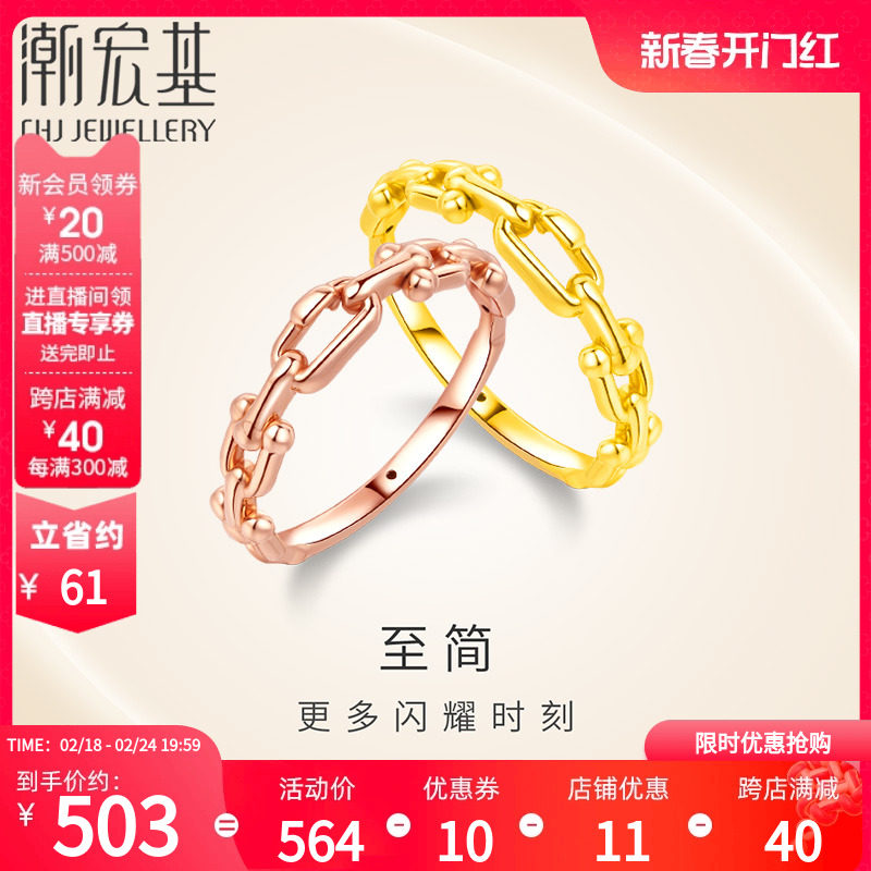 潮宏基至简18K金戒指叠戴指环通勤环扣马蹄扣显大个性送女友礼物