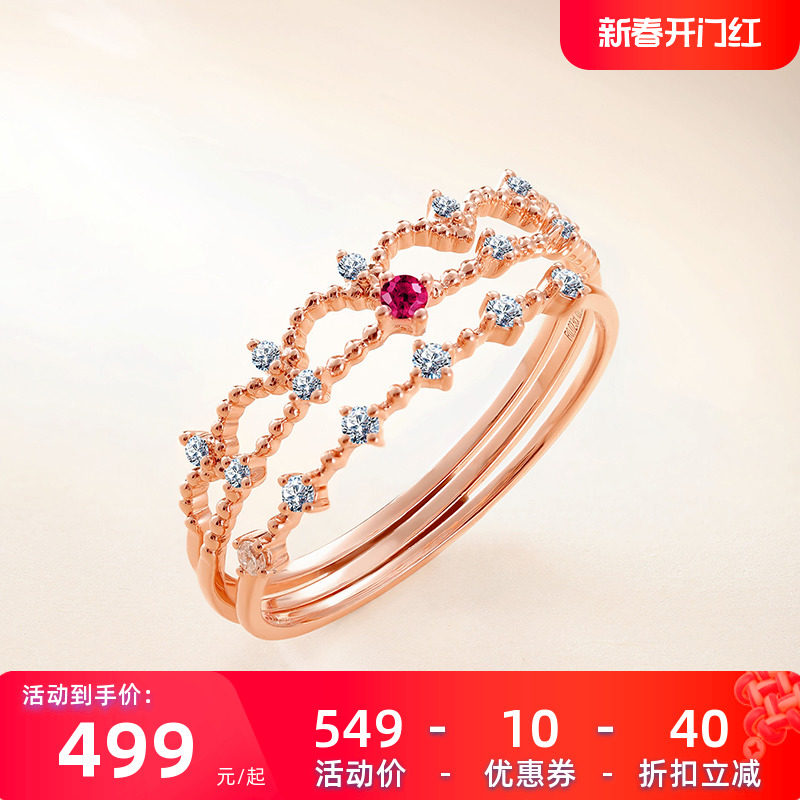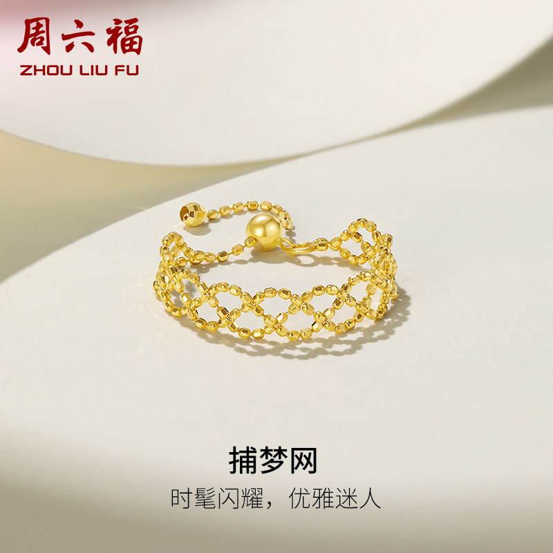 周六福黄18K金戒指蕾丝女彩金au750多复古软链调节镂空情人节礼物
