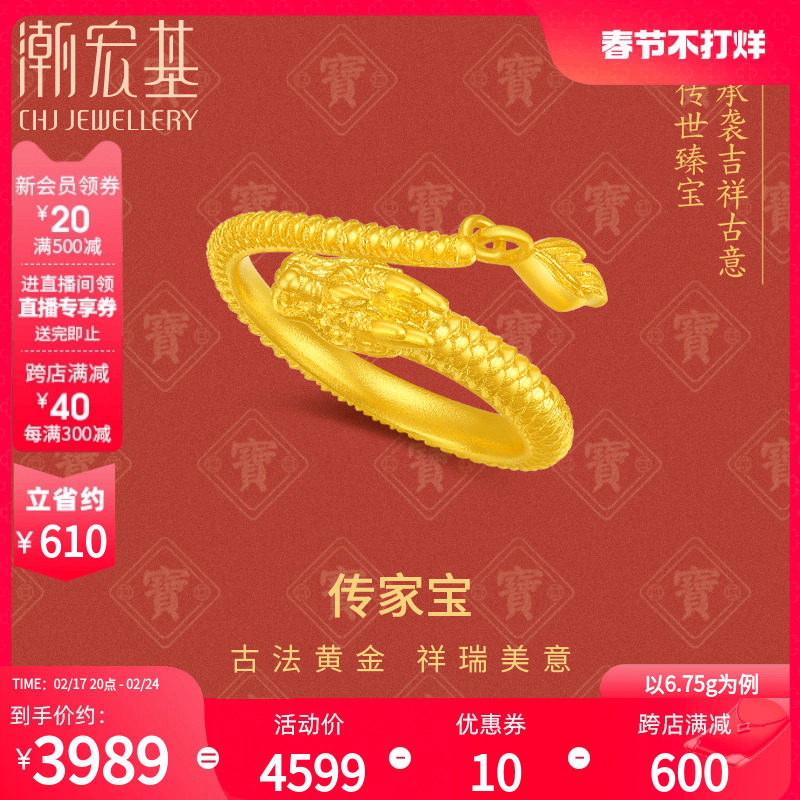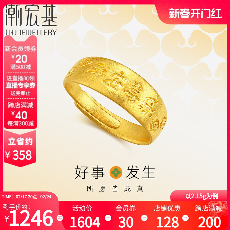 潮宏基御范足金戒指黄金戒圈莫比乌斯环三金5G礼物女可调节计价