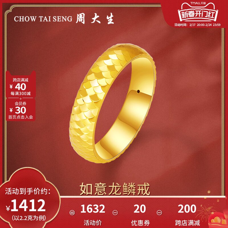 周大生黄金手饰足金龙鳞戒指3D硬金简约情侣对戒生日礼物送女生
