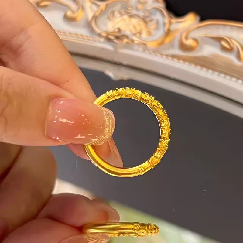 5G黄金雕花戒指新款小众时尚24K纯金紫荆花戒子999足金素圈指环女