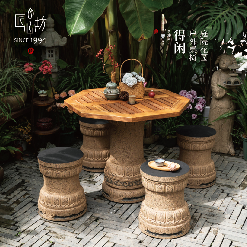 匠心坊中式花园布置户外庭院桌椅室外柚木桌子露台阳台院子圆桌