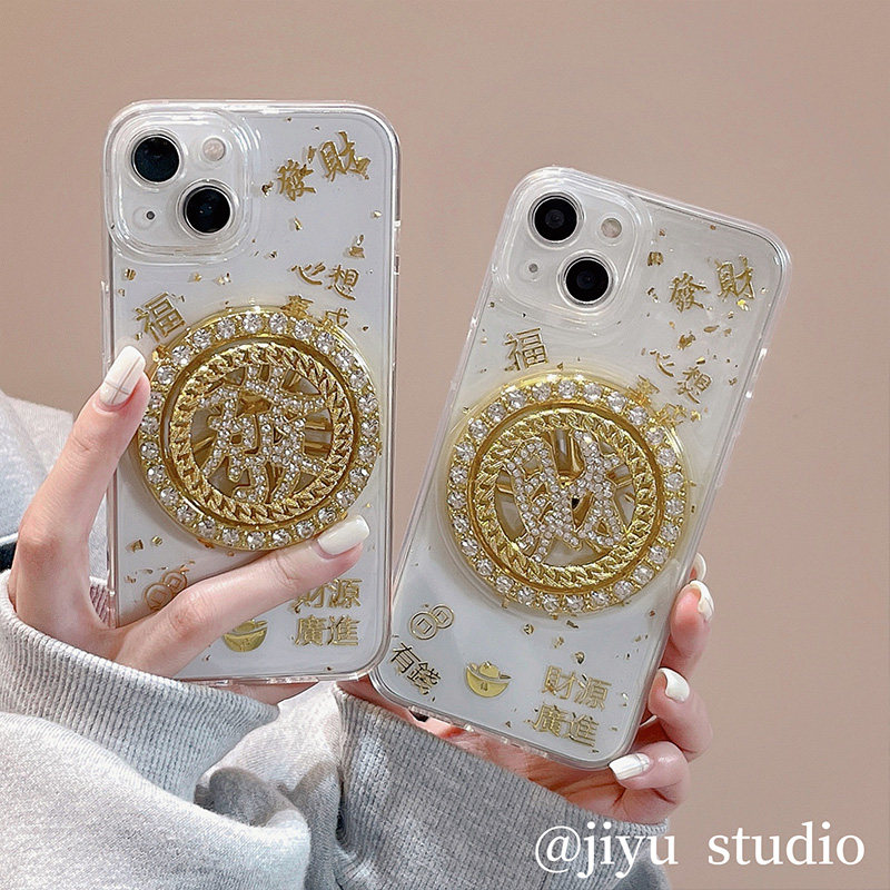 ins奢华金箔發財闪砖转盘支架适用苹果14pro max手机壳iphone13滴胶12新年款11硅胶14pro女十四高级感手机套