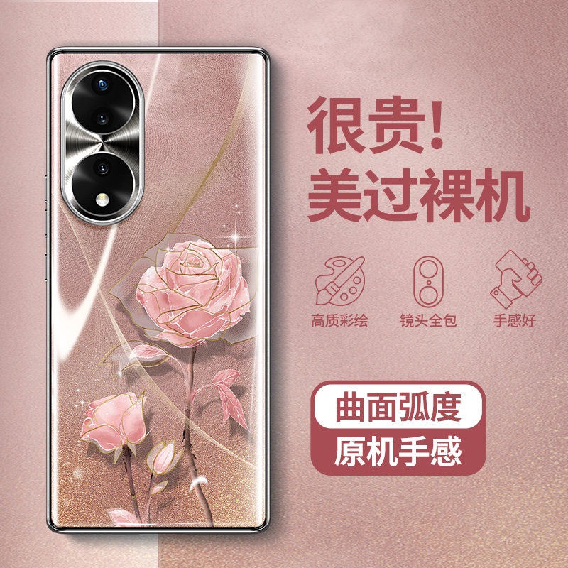 适用荣耀70手机壳华为70Pro新款女曲面屏高级感全包防摔honor的专用玻璃春天爆款POR高端玫瑰气质带挂绳pr0套