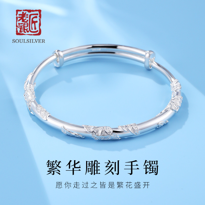 R繁花似锦银手镯s925推拉可调节手环 简约时尚小众送女友闺蜜礼物