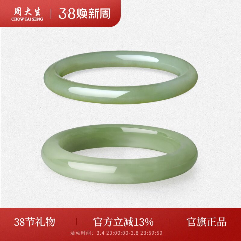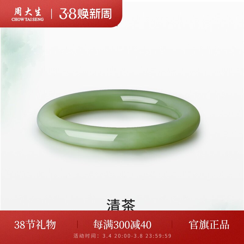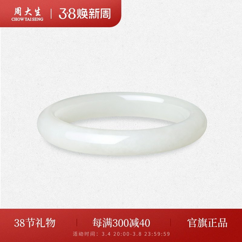 周大生天然和田白玉手镯女款皓月玉镯子送妈妈女友生日礼物新款