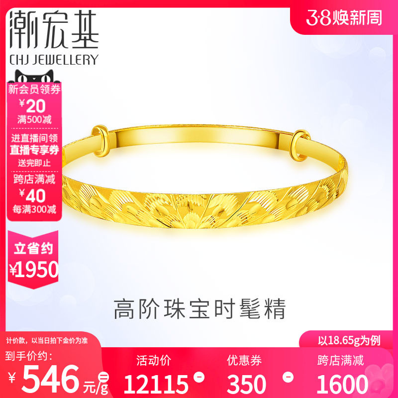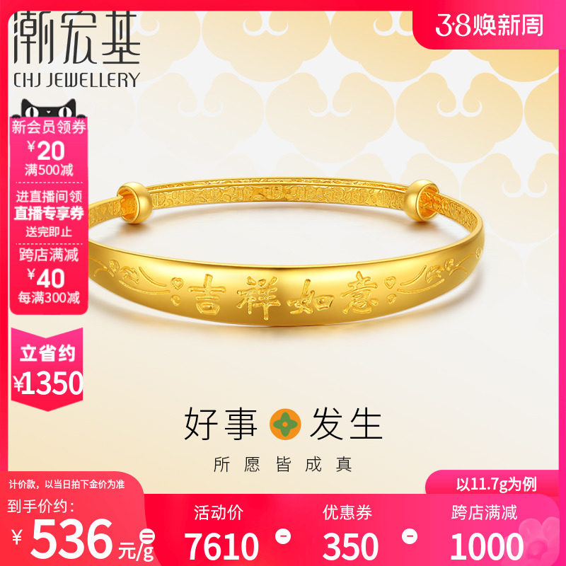 潮宏基好事发生吉祥如意黄金手镯足金童镯活口可调节宝宝计价H