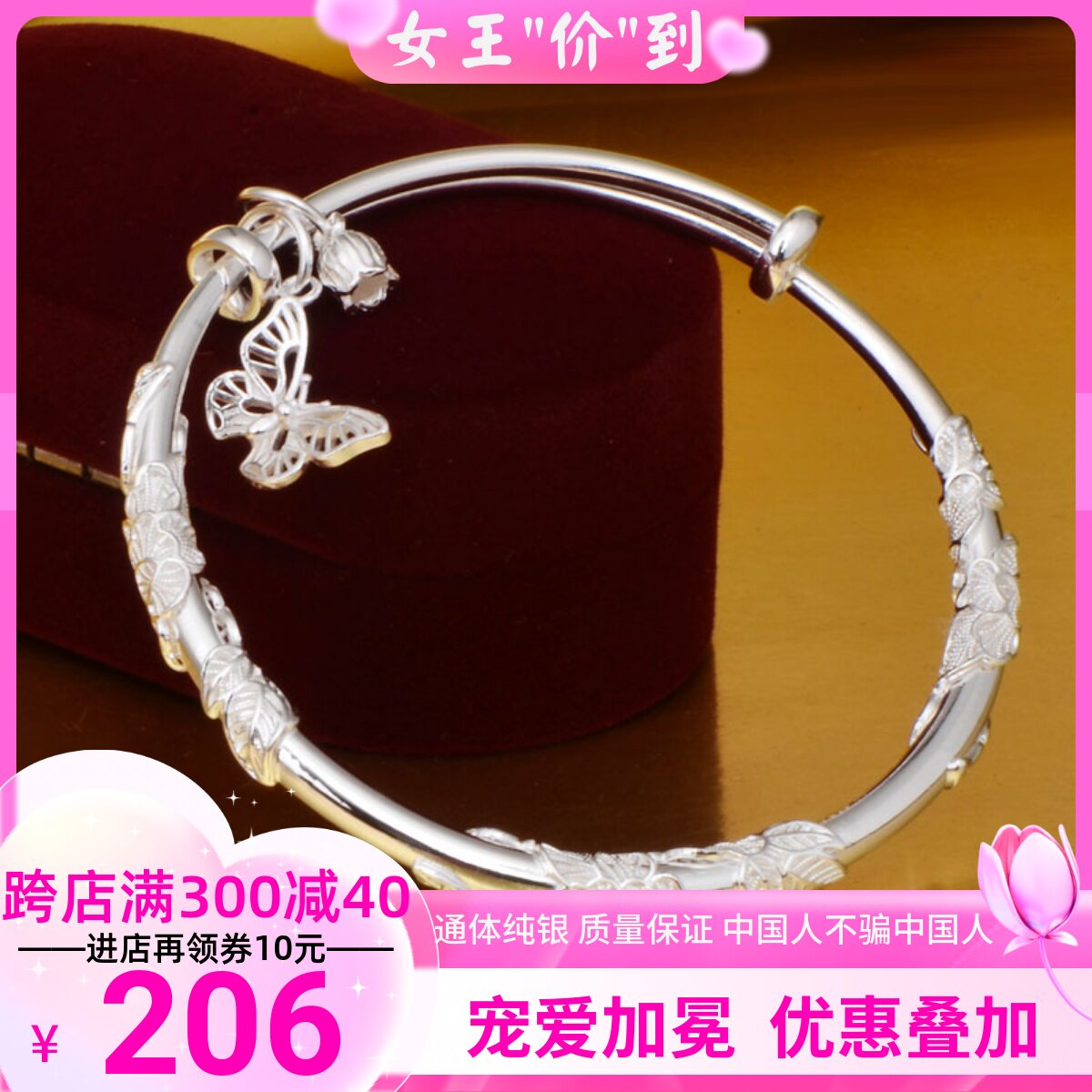 潮兴福实心推拉9999纯银手镯女繁花似锦蝶恋花足银镯子首饰品手环